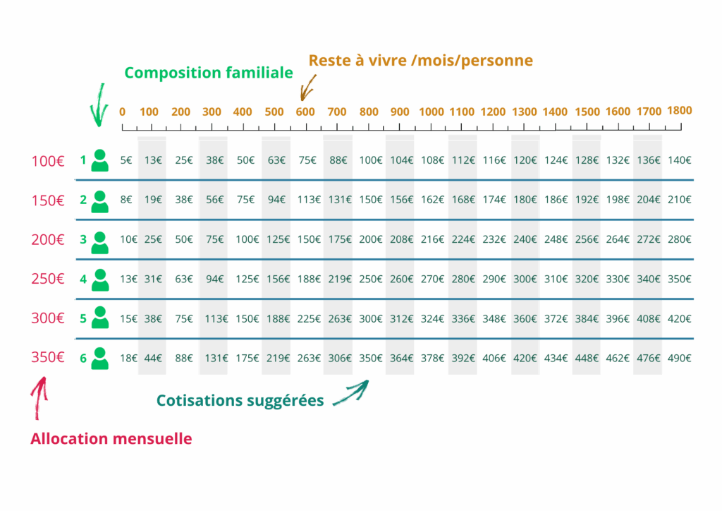 Un reste à vivre considéré comme décent est autour de 800€ par mois pour une personne seule, même s’il n’existe pas de seuil officiel. Nous avons pris ce montant pour construire la grille : une personne seule qui a un reste à vivre de 800€ par mois cotisera 100€ pour recevoir 100€.